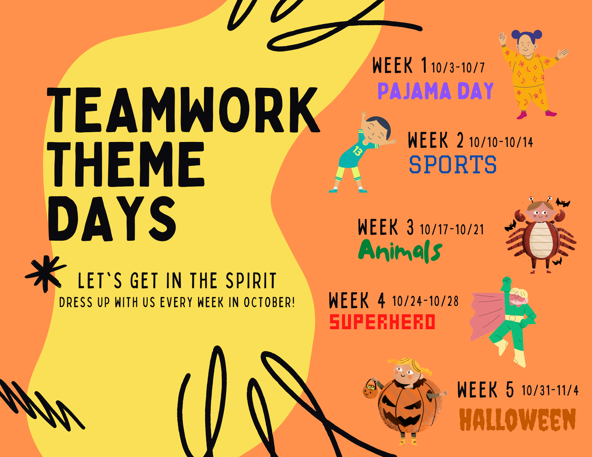Something new we’re doing to kick off Fall is Themed weeks. You and your kiddo are welcome to join our staff in dressing to theme for the whole month of October!